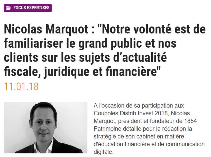 Nicolas Marquot : L’éducation financière est au cœur de la stratégie de communication de 1854 Patrimoine. Notre cabinet s’implique particulièrement dans la création de contenus d’information sur les sujets patrimoniaux à destination de nos clients mais aussi du grand public en général. Notre volonté est de familiariser le grand public et nos clients sur les sujets d’actualité fiscale, juridique et financière pouvant avoir un impact direct ou indirect sur la gestion de leur patrimoine. Et, de manière plus générale sur la gestion de l’épargne « au quotidien ».